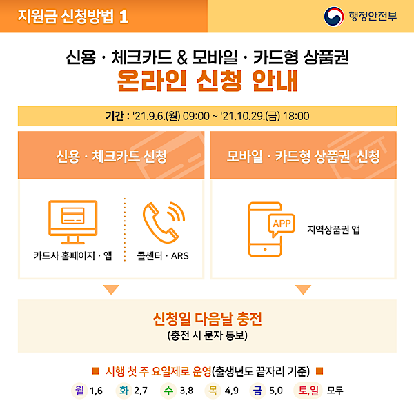 5차 재난지원금 신청 - 5차 재난지원금 신청 기간 및 대상 / 이번 5차 재난지원금은 작년 1차 긴급재난지원금과 마찬가지로 신용·체크카드, 선불카드 및 지역사랑상품권 2가지 방식으로 신청하게 됩니다.